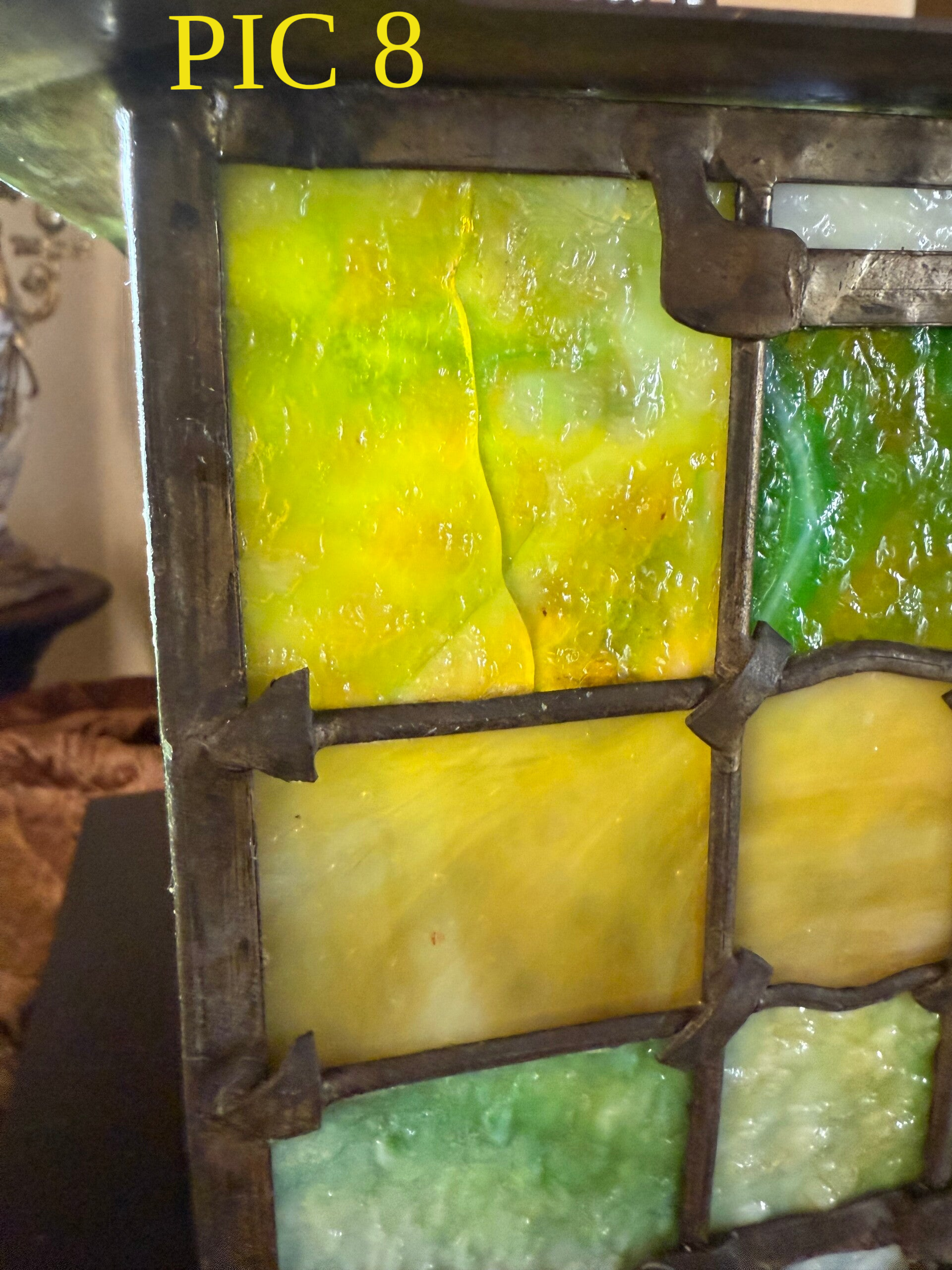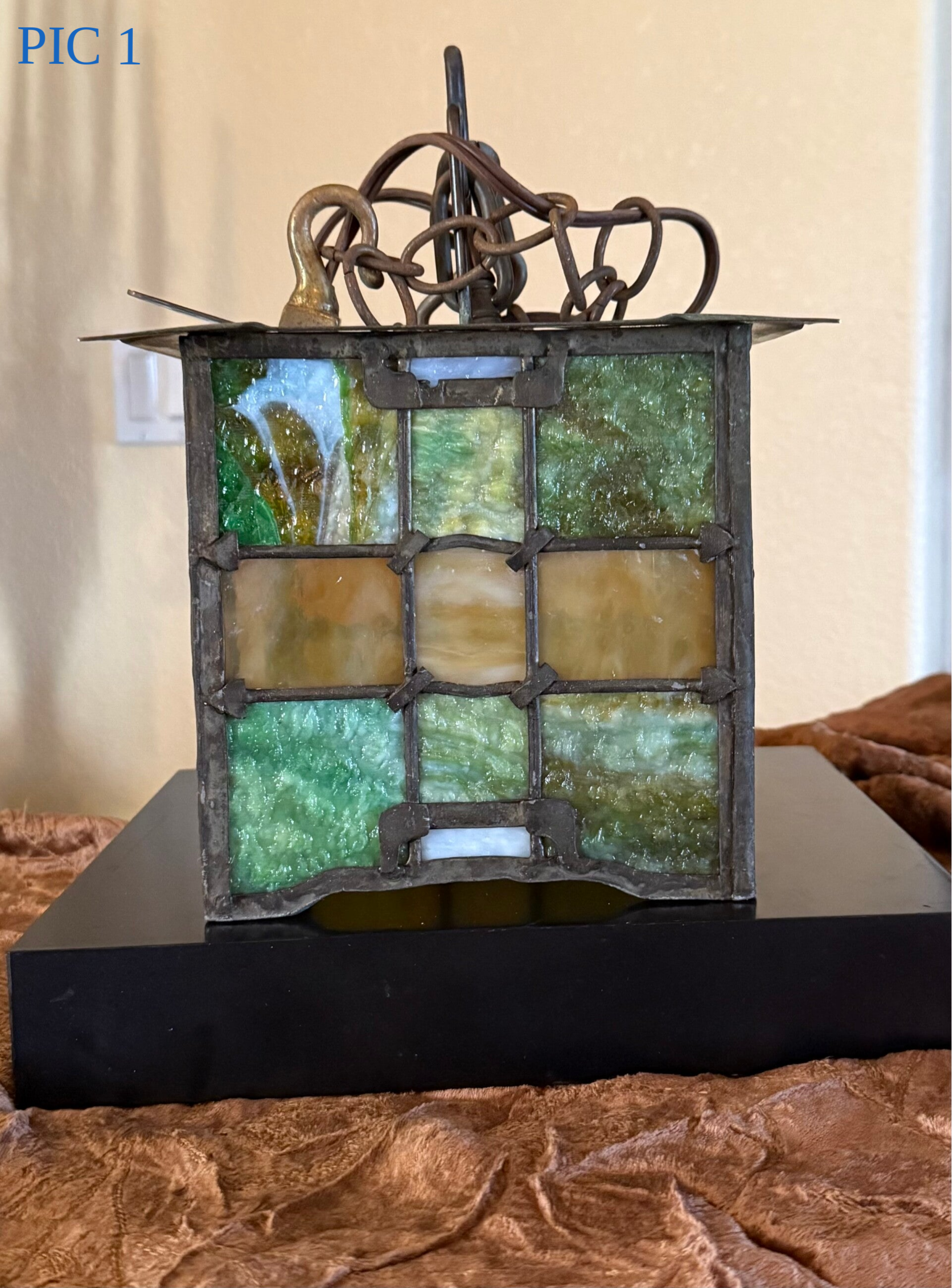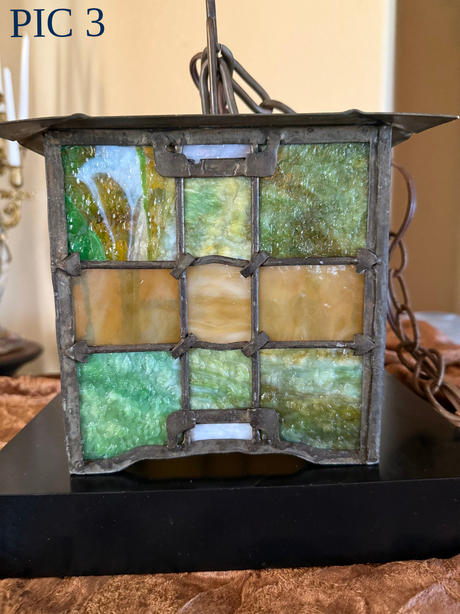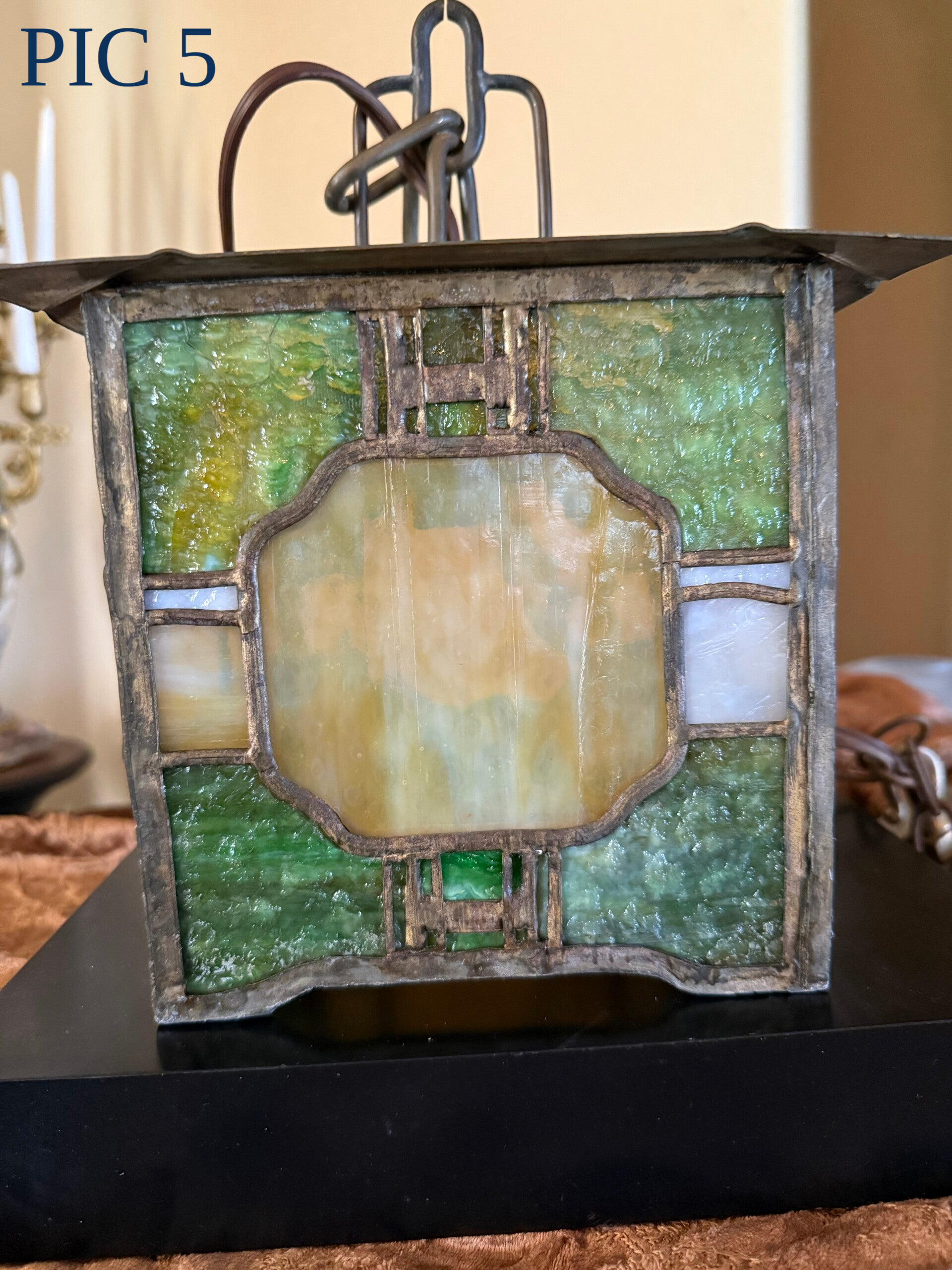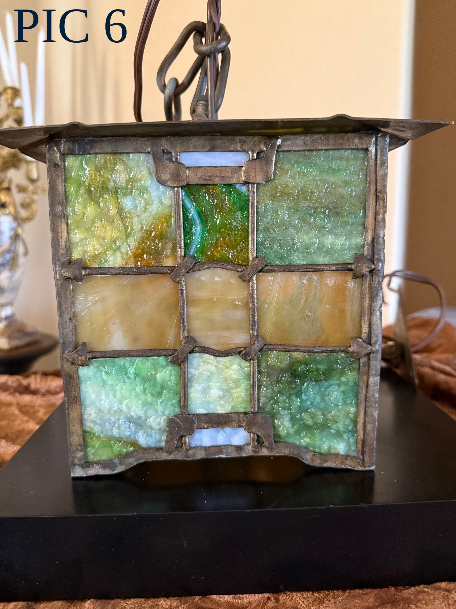 This lantern is an elegant piece of craftsmanship, made of patinated brass and featuring leaded glass panels. It's quite compact, measuring approximately 10 3/8 x 8 7/8 x 8 3/4 inches (26.3 x 22.5 x 22.2 cm), and was originally designed as part of the Adelaide Tichenor House project by renowned architects Greene & Greene in 1904. This lantern showcases the Japanese influences that were incorporated into the overall design of the house, adding a touch of cultural richness to the piece.